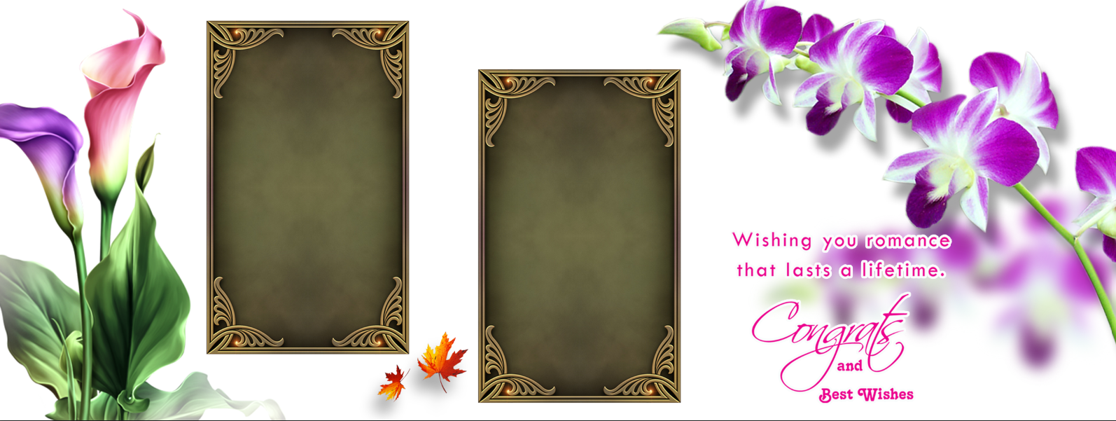 Design: Double Photo Frame with Orchids, Calla Lilies, and Congratulatory Text