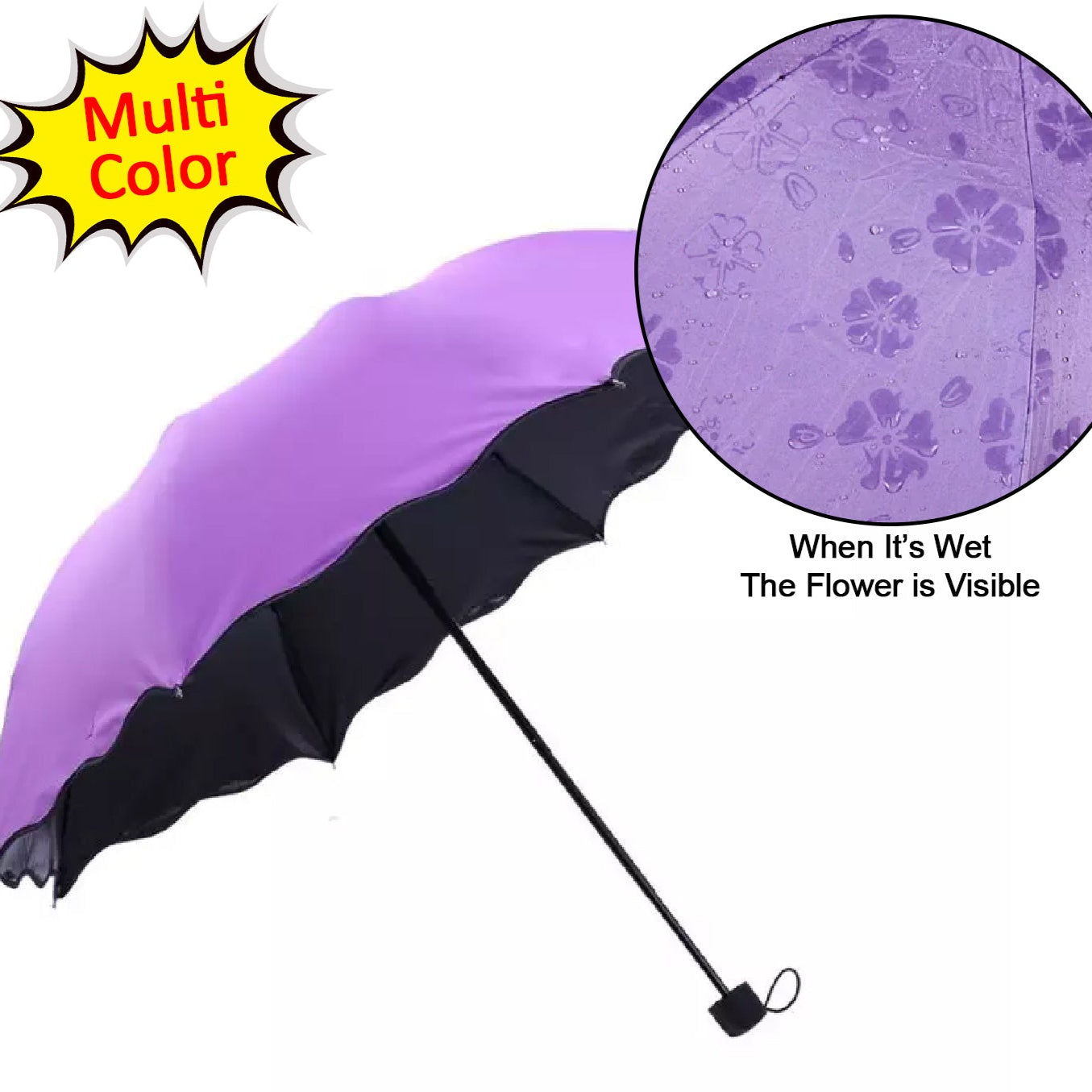 This compact umbrella features a unique magic print that reveals beautiful blossom patterns when it gets wet. It offers reliable protection from both rain and sun, making it a versatile accessory for everyday use. Enjoy its charming design and practical features in any weather.