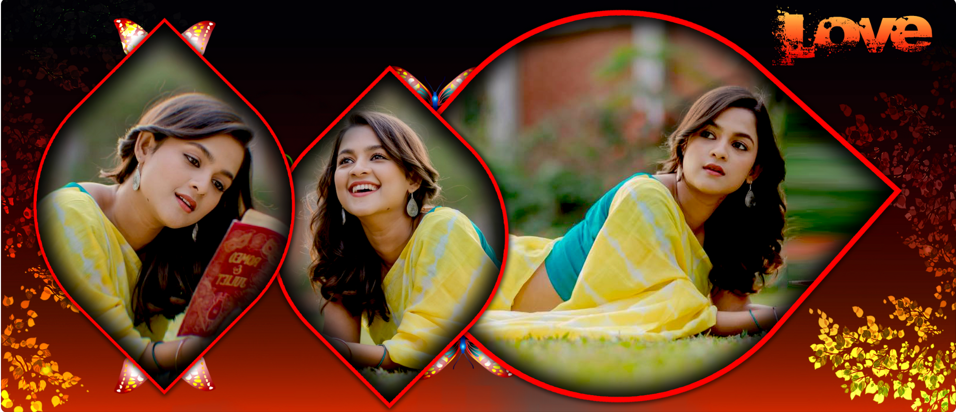 Maximize sentiment and style with this triple-slot photo mug designed for the Love Mugs category. The design features a sophisticated layout with a dark gradient background, striking red geometric borders, and elegant golden floral accents. A grunge-style "Love" text overlay completes the artistic aesthetic, making this 11oz ceramic mug a standout piece of personalized drinkware.