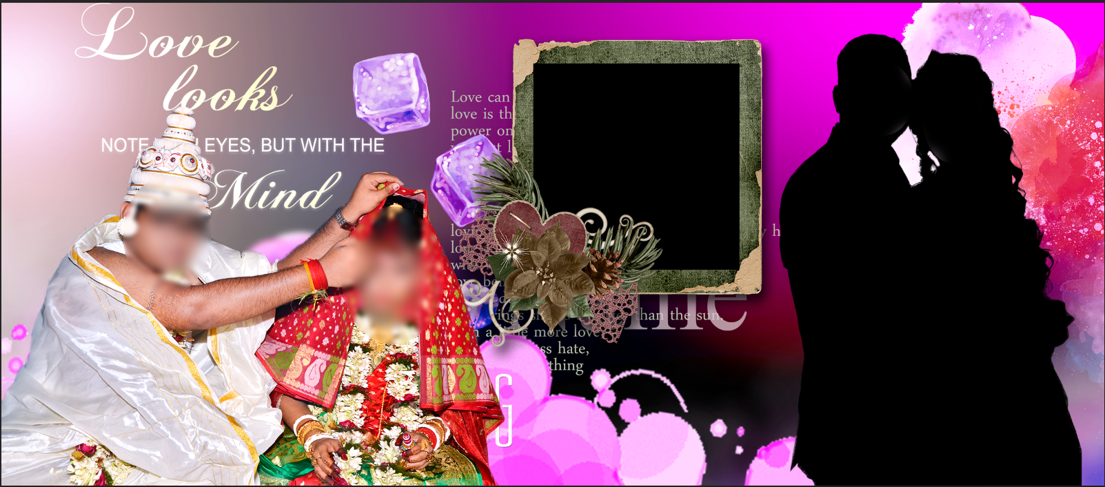 Capture the essence of your relationship with our Love Looks With The Mind custom ceramic mug. Designed specifically for anniversaries and weddings, this vibrant mug features a romantic hot pink and purple gradient background adorned with the timeless Shakespearean quote, "Love looks not with the eyes, but with the mind." The layout includes a stylish vintage frame and a dedicated space to showcase two of your most cherished photos, alongside an artistic silhouette of a loving couple.