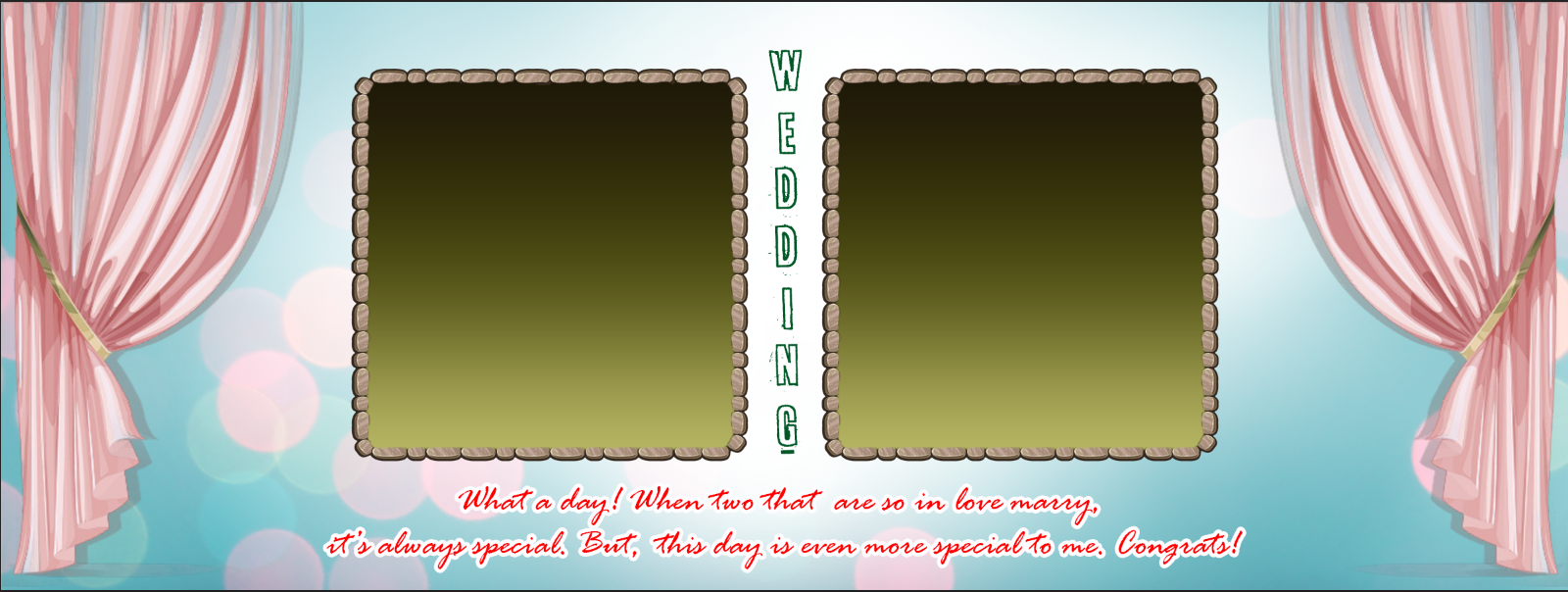 Celebrate the union of two hearts with our Pink Curtain Wedding Tribute Custom Mug. This exquisite personalized gift is designed to immortalize special wedding memories. The design features a romantic theater-style opening with elegant pink curtains, set against a dreamy light blue bokeh background. At the center, the word "WEDDING" is vertically aligned between two rustic stone-textured photo frames, waiting to showcase your favorite couple portraits. A heartfelt red script quote at the bottom reads, "What a day! When two that are so in love marry, it's always special," making this 11oz ceramic mug a sentimental keepsake for newlyweds or a thoughtful anniversary present.