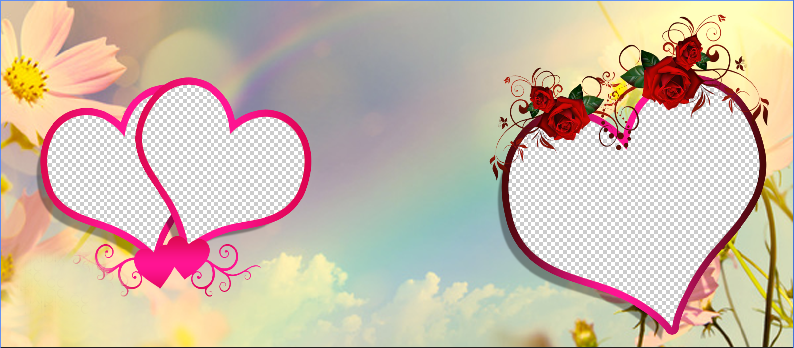 Celebrate your most cherished moments with our Romantic Roses & Twin Hearts Custom Mug. This exquisite design features a dreamy, soft-focus background with a subtle rainbow and delicate wildflowers. The layout includes three distinct photo slots: two interlocking pink hearts perfect for couple portraits, and a larger heart frame elegantly adorned with deep red roses and decorative swirls. It is the ultimate personalized gift for anniversaries, Valentine's Day, or simply to show someone you care.
